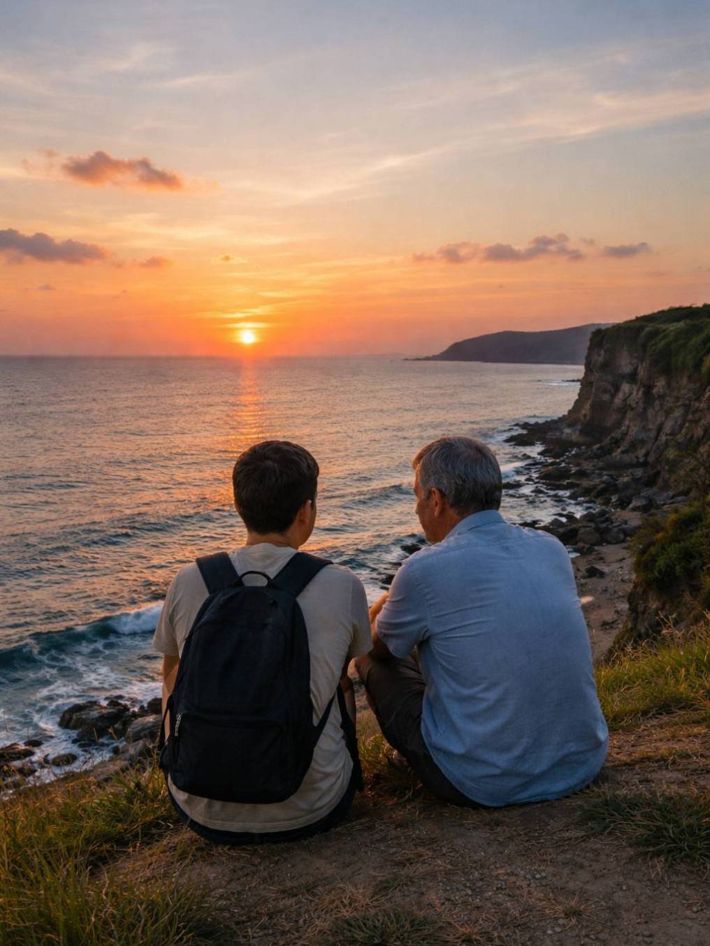 一名大學生陪著父親沿著海邊散步,在一處懸崖旁停下來休息。