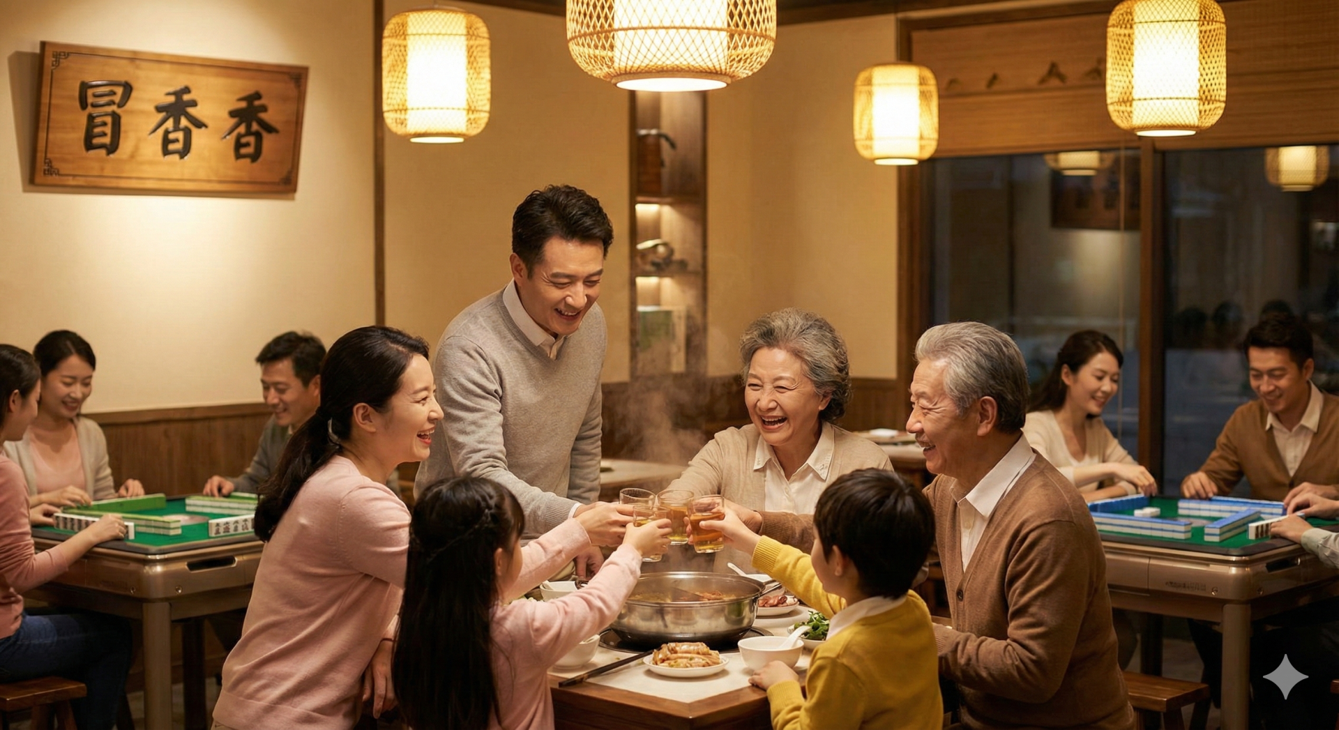 ▲ 柔和暖光下,一家人圍繞著火鍋舉杯慶祝。《冒香香》致力於打造一個讓顧客願意「慢下來、留下來」的溫暖記憶製造所。