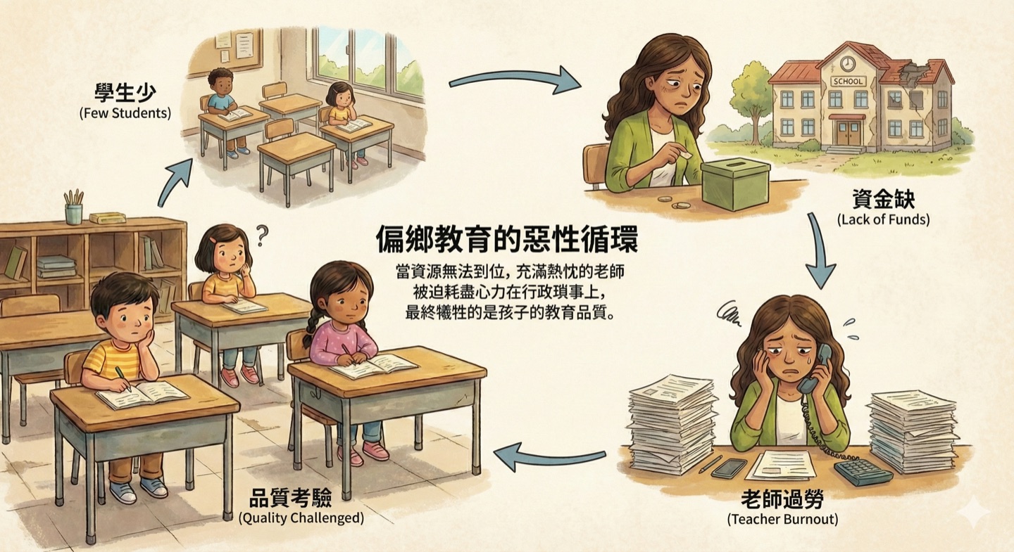 這是一個惡性循環: 學生少 > 資金缺 > 老師兼行政過勞 > 教育品質面臨考驗。