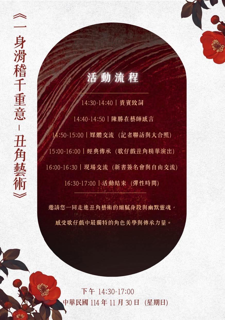 這是台灣極少數以「丑角藝術」為主軸的專書出版,也是陳勝在藝師對後輩與戲曲文化的深情傳承。新書發表會將提供 現場購書 7 折優惠,並開放 限量簽名,極具收藏價值。