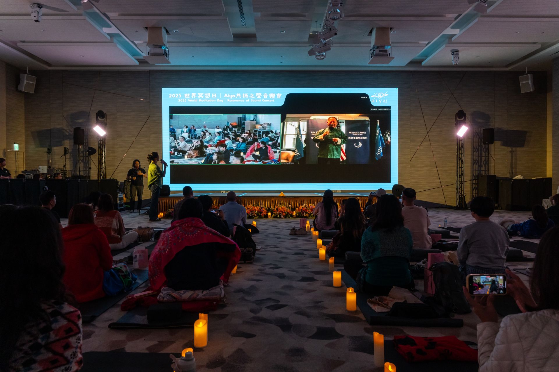 當音樂逐步引導觀眾進入冥想狀態,現場氣氛轉為深沉而安定。進入全球同步冥想儀式時段後,台灣與多國同時連線,在同一時間進行靜心,這種「與世界一起安靜下來」的經驗,讓參與者感受到自身不再是孤立的個體,而是全球冥想網絡中的一部分。
