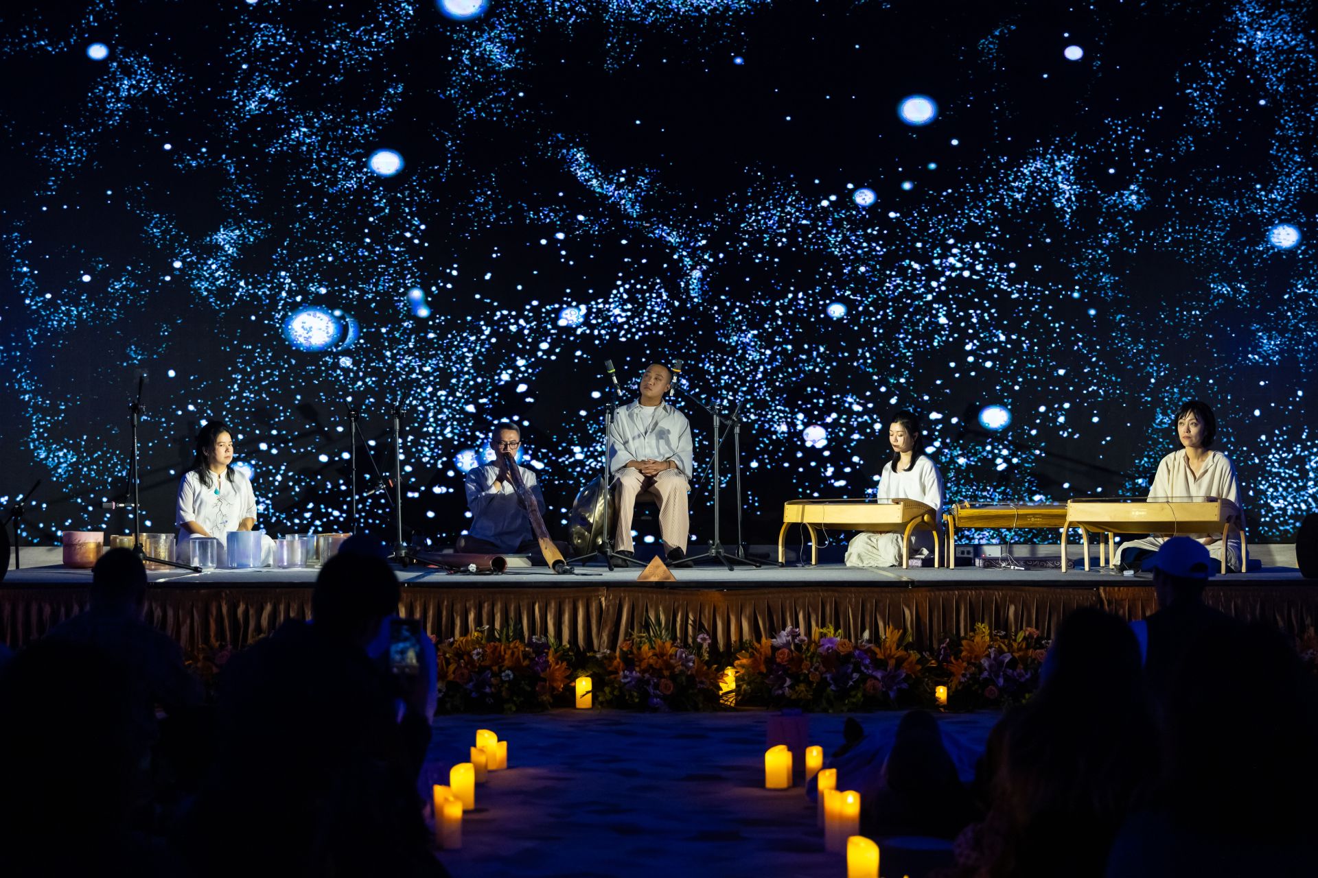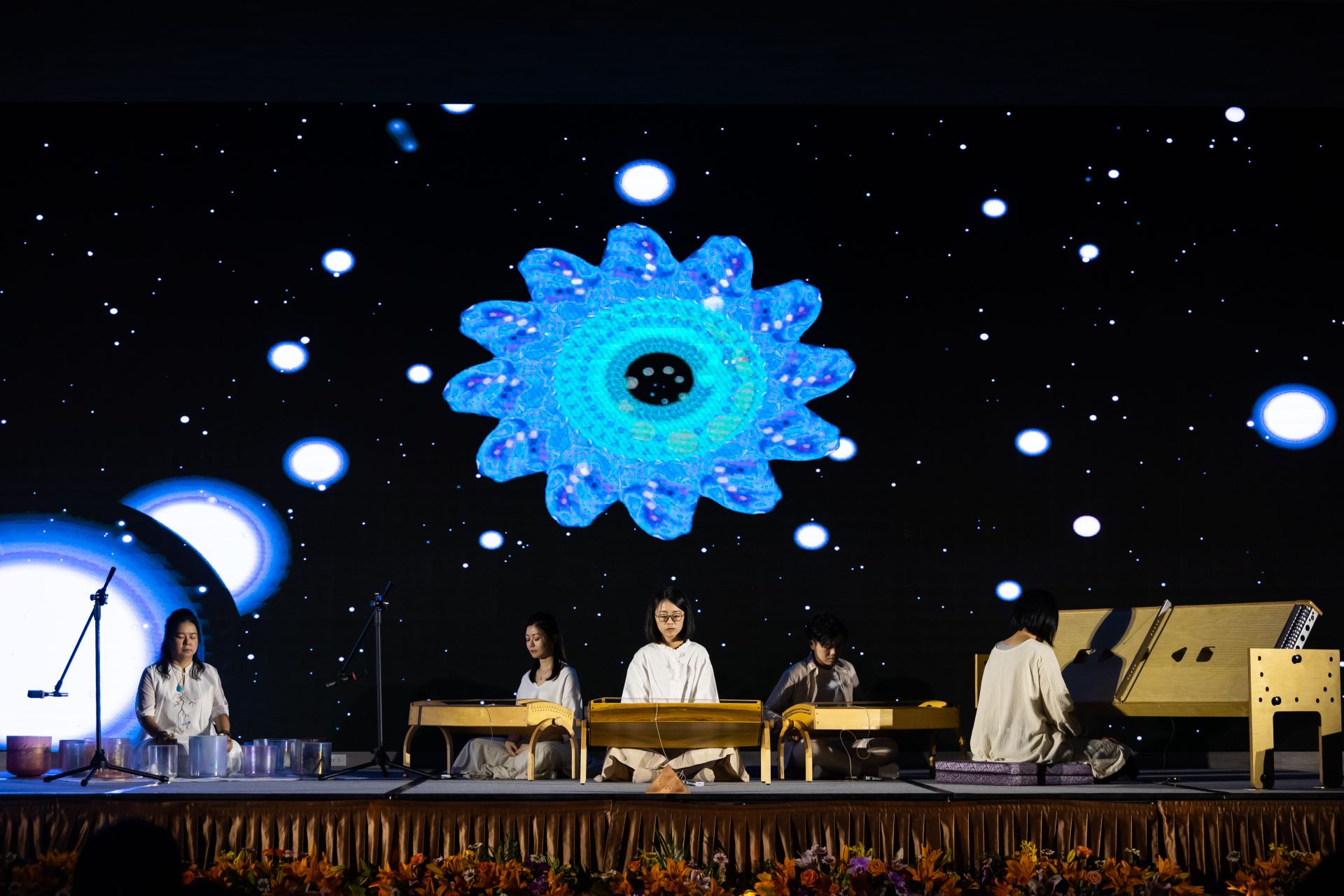 音樂會以「地球共振」為舞台概念,透過手碟、梵唱、水晶缽、脈輪舞蹈與行星演奏等聲音形式,為冥想鋪陳出可被身體感知的節奏與頻率,使冥想不再只是靜坐,而是一場由音樂引領、身心與意識共同參與的集體體驗。