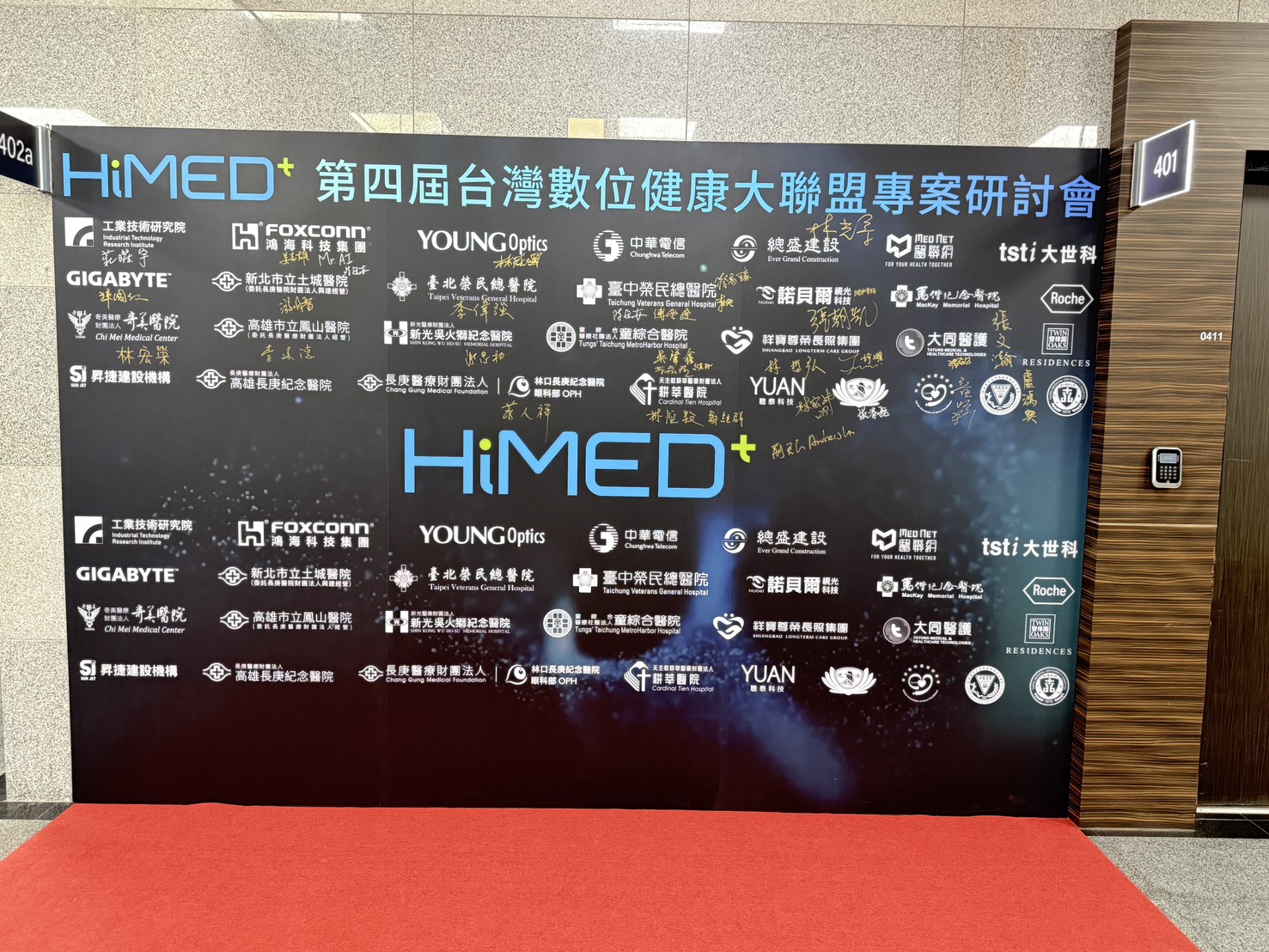 「HiMED+第四屆台灣數位健康大聯盟專案研討會貴賓簽名背板,集結工研院、鴻海集團等數位健康醫療的領域菁英參與。」(記者陶成蹊攝)