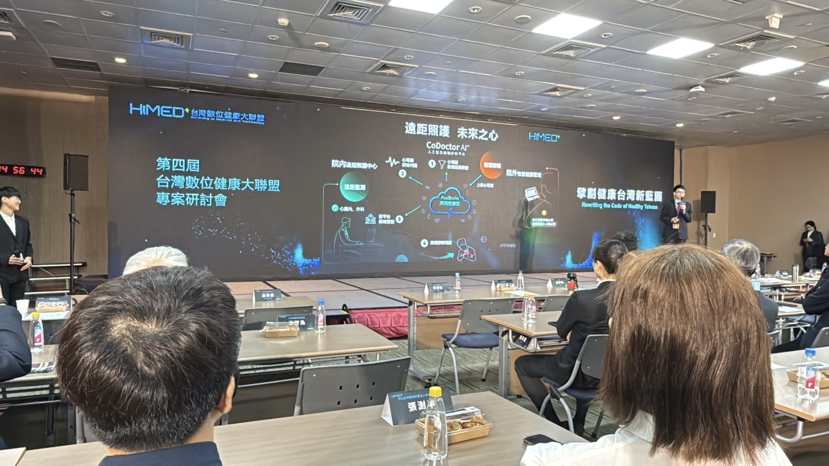 「HiMED+第四屆台灣數位健康大聯盟專案研討會現場,講者說明遠距照護與CoDoctor AI應用,產官學醫界代表專心聆聽交流景況」(記者陶成蹊攝)