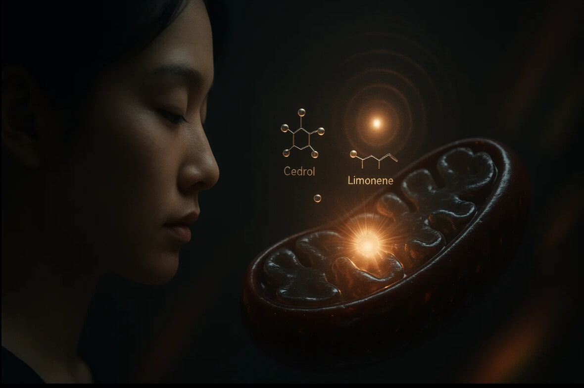 有趣的是,啟動粒線體並不一定要走進深山。你每天的生活,其實就能悄悄模擬森林裡的「能量啟動條件」。研究顯示,低劑量、可控性的植物氣味刺激——特別是單一成分的 Cedrol 或柑橘類檸檬烯——就能引發粒線體調節、提升 ATP、生合成蛋白與抗氧化能力(註7)。這種微刺激就像在廚房裡輕輕轉小火,不需要大火快炒,也能讓湯慢慢變暖。